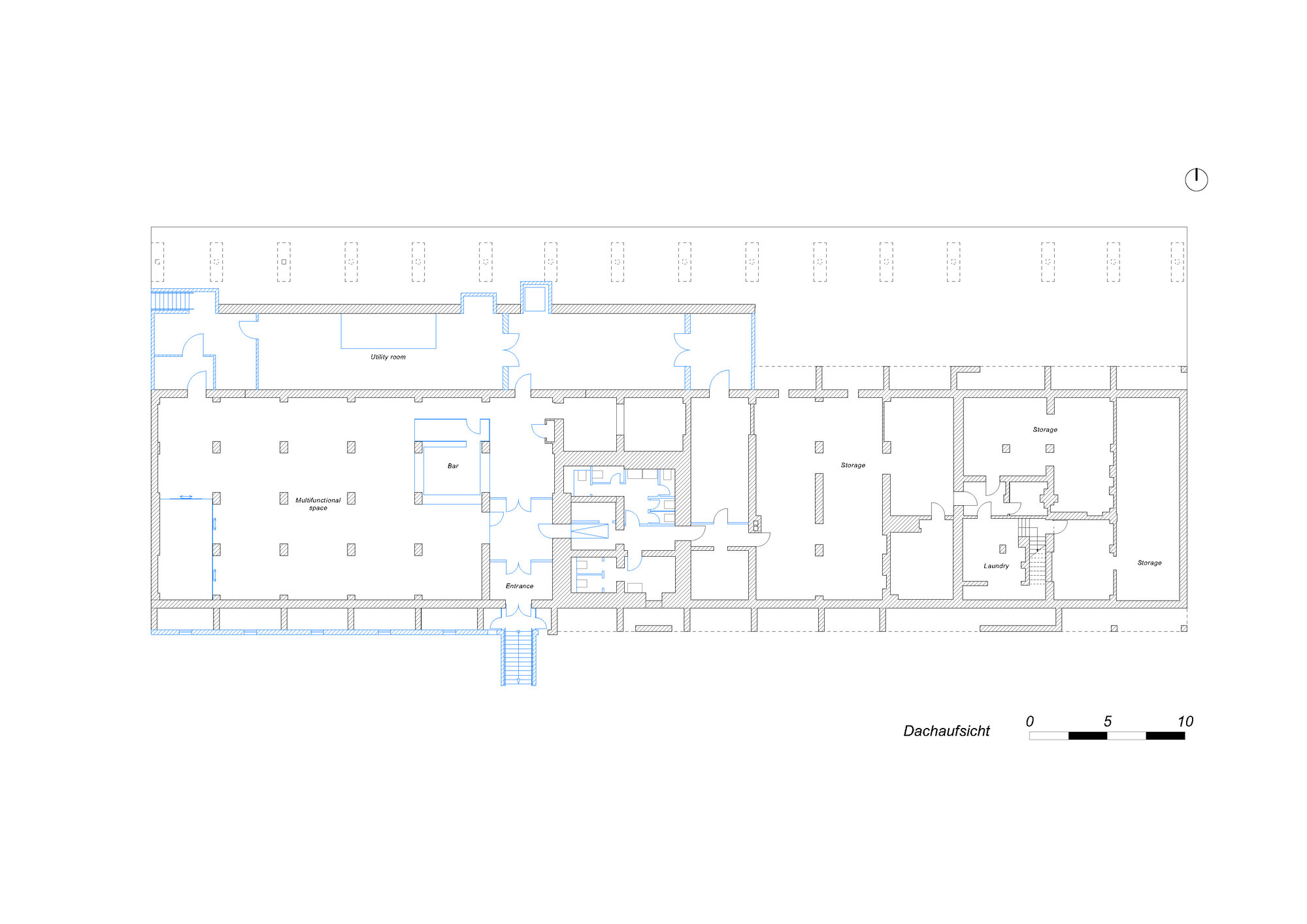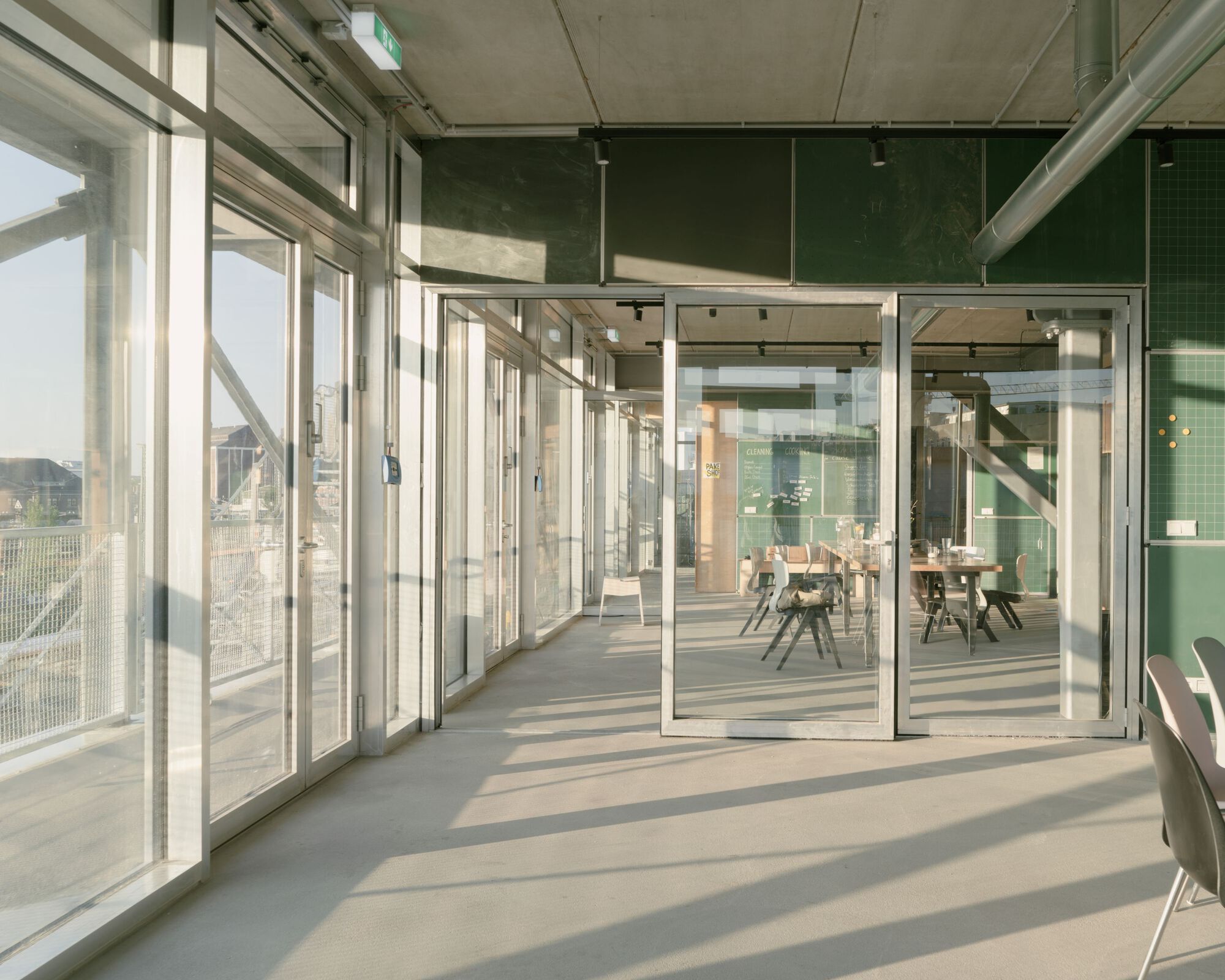 兩座顯眼的戶外樓梯,引導人們通往全新的上層樓,此樓層四周被迴廊式的走道所環繞。這些走道不僅是動線,更是空間的延伸,它們同時提供了從室內及室外進入上層空間的多重路徑,徹底模糊了建築的內外分野。而原有的屋頂,則被轉化為一個可供使用的大型露台,提供了無與倫比的城市全景視野。這種將動線與觀景平台外部化的設計,極大地促進了空間的開放性與公共性,成為建築的畫龍點睛之筆。